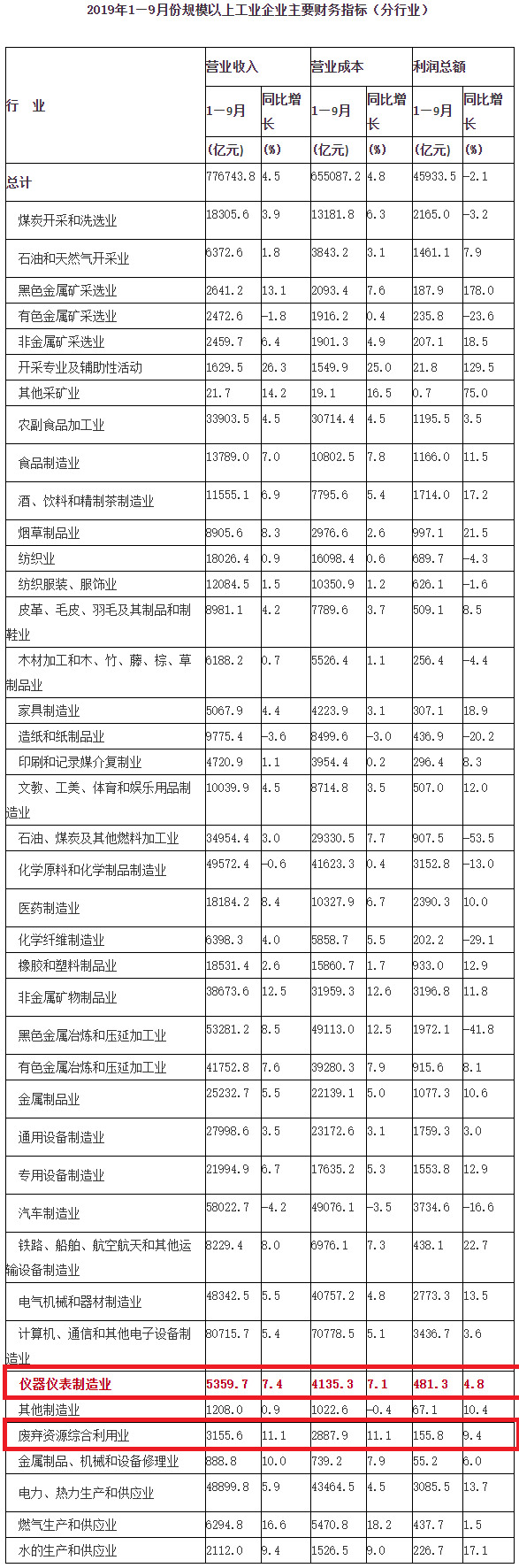 10月27日,國(guó)家統(tǒng)計(jì)局發(fā)布了1-9月份全國(guó)規(guī)模以上工業(yè)企業(yè)利潤(rùn)增長(zhǎng)狀況。1—9月份,全國(guó)規(guī)模以上工業(yè)企業(yè)實(shí)現(xiàn)利潤(rùn)總額45933.5億元,同比下降2.1%,降幅比1—8月份擴(kuò)大0.4個(gè)百分點(diǎn)。其中,儀器儀表制造業(yè)實(shí)現(xiàn)利潤(rùn)總額481.3億元,同比增長(zhǎng)4.8%;廢棄資源綜合利用業(yè)...