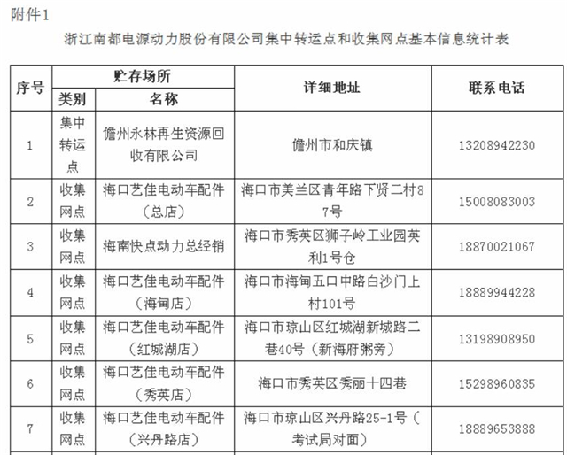 依據(jù)《海南省鉛蓄電池生產企業(yè)集中收集和跨區(qū)域轉運制度試點工作方案》,經審查和研究確定浙江南都電源動力股份有限公司、浙江天能環(huán)??萍加邢薰?、安徽力普拉斯電源技術有限公司、海南超能梯次再生資源有限公司、風帆有限責任公司等5家公司為廢鉛蓄電池試點單位?,F(xiàn)將試點單位集中轉運點名稱與聯(lián)系方式、收集網點名稱與...