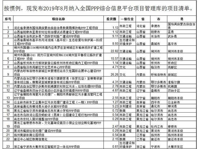 按慣例,現(xiàn)發(fā)布2019年8月納入全國PPP綜合信息平臺項目管理庫的項目清單。 原標(biāo)題:【獨家】2019年8月發(fā)布的131個新入管理庫項目清單