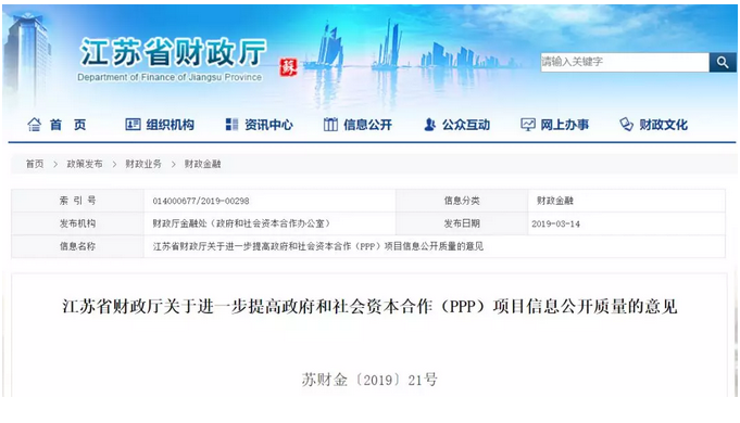 江蘇省財政廳關(guān)于進(jìn)一步提高政府和社會資本合作(PPP)項目信息公開質(zhì)量的意見蘇財金〔2019〕21號各市、縣財政局:為深入貫徹落實國務(wù)院辦公廳《關(guān)于推進(jìn)社會公益事業(yè)建設(shè)領(lǐng)域政府信息公開的意見》(國辦發(fā)﹝2018﹞10號)、財政部《政府和社會資本合作(PPP)綜合信息平臺信息公開管理暫行辦法》(財金﹝...
