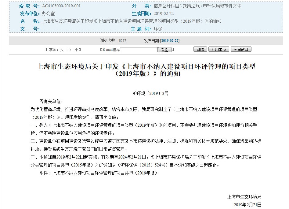 文章導讀“全市超過1/4的建設項目將不需要辦理環(huán)評手續(xù)了?!庇浾呓諒纳虾J猩鷳B(tài)環(huán)境局了解到,最新出臺的《上海市不納入建設項目環(huán)評管理的項目類型(2019年版)》以正面清單方式,明確了上海市范圍內不納入建設項目環(huán)評管理的項目類型。來源:中國環(huán)境報 據(jù)上海市生態(tài)環(huán)境局介紹,《豁免名錄》實施后,上海超過...
