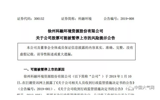 徐州科融環(huán)境資源股份有限公司1月17日發(fā)布公告稱(chēng),科融環(huán)境股票可能面臨被暫停上市的風(fēng)險(xiǎn)??迫诃h(huán)境于2019年1月10日,在巨潮資訊網(wǎng)上披露了《關(guān)于公司相關(guān)人員收到行政監(jiān)管措施決定書(shū)的公告》(公告編號(hào):2019-001)、《關(guān)于公司收到行政監(jiān)管措施決定書(shū)的公告》(公告編號(hào):2019-002)。根據(jù)本次...