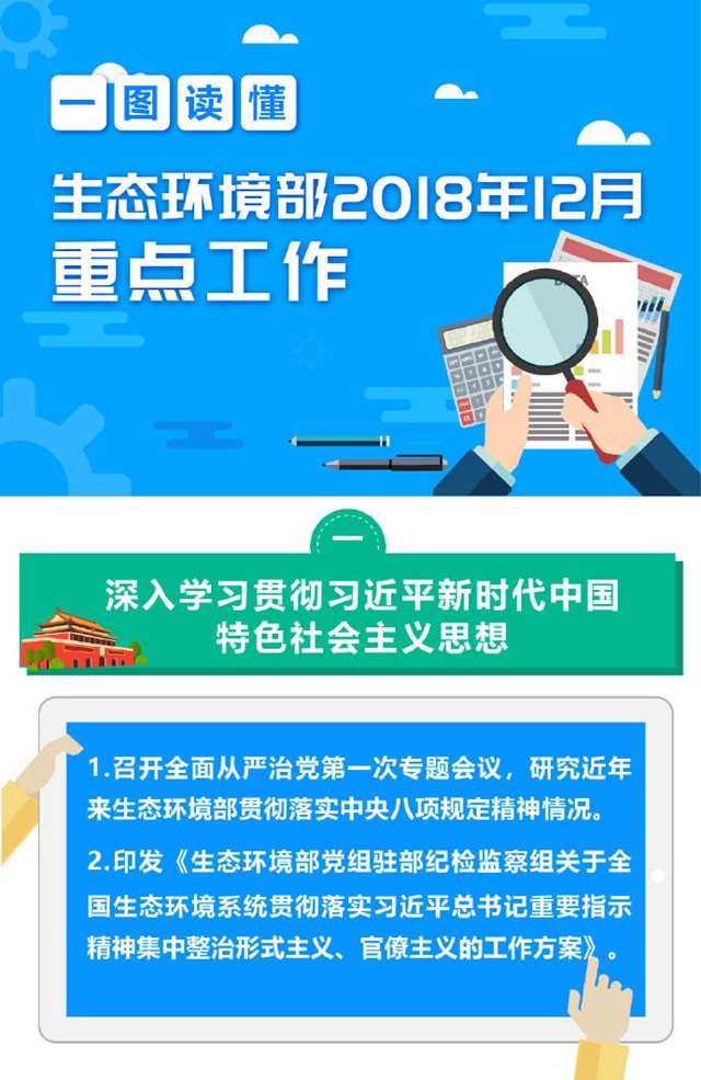 2018年12月,生態(tài)環(huán)境部重點(diǎn)工作是什么?近日,生態(tài)環(huán)境部微博以圖文形式向社會(huì)公開(kāi)劃重點(diǎn)。例如:召開(kāi)全面從嚴(yán)治黨第一次專(zhuān)題會(huì)議,研究近年來(lái)生態(tài)環(huán)境部貫徹落實(shí)中央八項(xiàng)規(guī)定精神情況;持續(xù)推進(jìn)全國(guó)集中式飲用水水源地環(huán)境整治;印發(fā)《生態(tài)環(huán)境損害鑒定評(píng)估技術(shù)指南土壤與地下水》《汾渭平原、長(zhǎng)三角地區(qū)城市環(huán)境空...