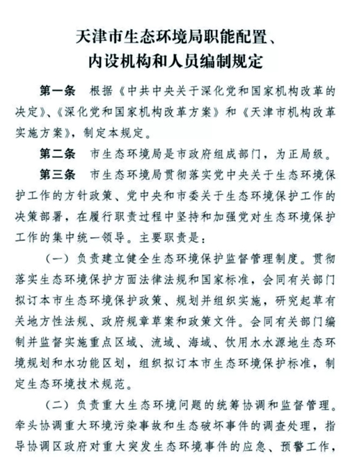 天津生態(tài)環(huán)境保護(hù)機(jī)構(gòu)改革懸念落地,方案正式揭蓋!2018年12月30日,天津市委市政府發(fā)布了《天津市生態(tài)環(huán)境局職能配置、內(nèi)設(shè)機(jī)構(gòu)和人員編制規(guī)定》。無(wú)論是職能配置,還是內(nèi)設(shè)機(jī)構(gòu)、人員編制,都比此前坊間傳聞的變化更多更大,也凸顯了“茲事”確實(shí)“體大”,更表明了新時(shí)期生態(tài)環(huán)境保護(hù)使命之重、任務(wù)之重!天津市...