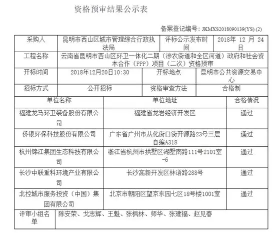 據(jù)中國(guó)政府采購(gòu)網(wǎng)消息,云南省昆明市西山區(qū)環(huán)衛(wèi)一體化二期(涉農(nóng)街道和全區(qū)河道)PPP)項(xiàng)目(二次)發(fā)布資格預(yù)審結(jié)果,福建龍馬環(huán)衛(wèi)裝備股份有限公司、僑銀環(huán)??萍脊煞萦邢薰尽⒑贾蒎\江集團(tuán)生態(tài)科技有限公司、長(zhǎng)沙中聯(lián)重科環(huán)境產(chǎn)業(yè)有限公司、北控城市服務(wù)投資(中國(guó))集團(tuán)有限公司等五家環(huán)衛(wèi)知名企業(yè)通過資格預(yù)審。 ...