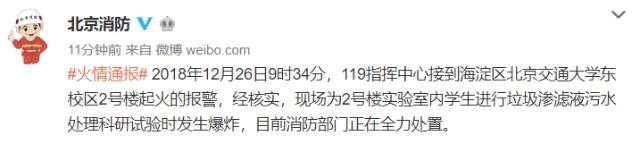 北京市公安局消防局官方微博剛剛發(fā)布火情通報(bào),2018年12月26日9時(shí)34分,119指揮中心接到海淀區(qū)北京交通大學(xué)東校區(qū)2號(hào)樓起火的報(bào)警,經(jīng)核實(shí),現(xiàn)場(chǎng)為2號(hào)樓實(shí)驗(yàn)室內(nèi)學(xué)生進(jìn)行垃圾滲濾液污水處理科研試驗(yàn)時(shí)發(fā)生爆炸,目前消防部門正在全力處置。