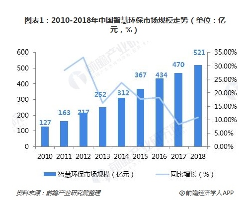 在“十三五”的環(huán)保政策熱潮以及ICT技術(shù)成熟背景下,我國智慧環(huán)保行業(yè)發(fā)展迅速,據(jù)測算,2018年行業(yè)規(guī)模為521億元,同比增長10.91%,2010-2018年行業(yè)復(fù)合增速達(dá)到19.31%。 一、市場規(guī)模:政策熱潮和技術(shù)發(fā)展雙催動,智慧環(huán)保市場增長空間大 “十三五...