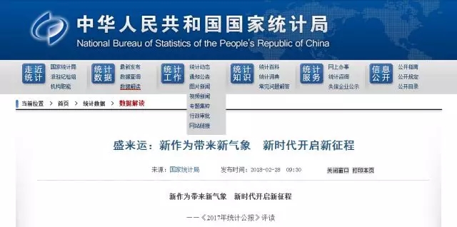 國(guó)家統(tǒng)計(jì)局網(wǎng)站28日公布《2017年國(guó)民經(jīng)濟(jì)和社會(huì)發(fā)展統(tǒng)計(jì)公報(bào)》,筆筆數(shù)據(jù)記錄了全國(guó)各族人民拼搏奮進(jìn)的累累碩果,張張圖表展示了黨的十八大以來我國(guó)發(fā)展取得的歷史性成就、發(fā)生的歷史性變革。為幫助讀者更好地理解公報(bào)的豐富內(nèi)涵,國(guó)家統(tǒng)計(jì)局黨組成員、總經(jīng)濟(jì)師盛來運(yùn)發(fā)表了題為《新作為帶來新氣象 新時(shí)代開啟新征程...