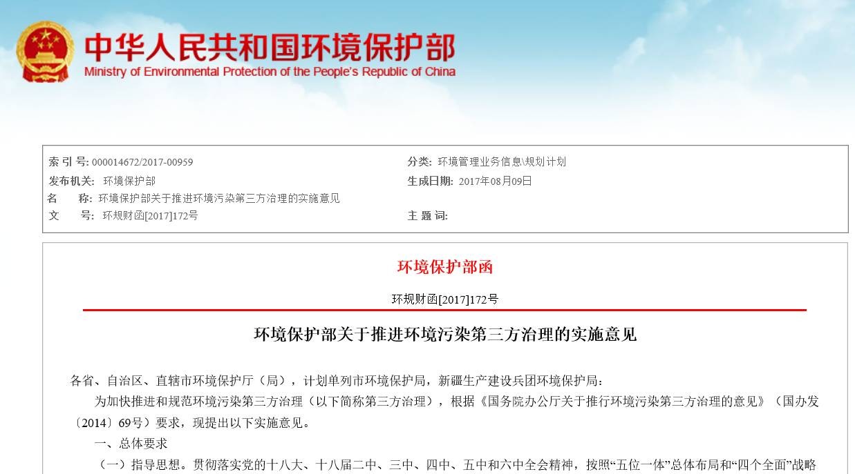 文章導(dǎo)讀 為加快推進(jìn)和規(guī)范環(huán)境污染第三方治理,環(huán)保部發(fā)布《環(huán)境保護(hù)部關(guān)于推進(jìn)環(huán)境污染第三方治理的實(shí)施意見》。文件中,細(xì)化環(huán)境污染第三方治理。劃定第三方責(zé)任,指出第三方治理單位應(yīng)建立臺(tái)賬記錄,將構(gòu)建第三方治理信息平臺(tái)。企業(yè)污染排放超標(biāo)超總量的,將實(shí)施第三方限期治理。并提出引入第三方支付機(jī)制,依環(huán)境績(jī)效...