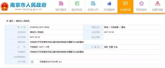 10月19日,南京市政府公布了《南京市低價(jià)值可回收物回收處理暫行辦法》,根據(jù)辦法規(guī)定,城市管理部門負(fù)責(zé)管理轄區(qū)內(nèi)低價(jià)值可回收物回收工作,并通過政府采購方式向企業(yè)購買低價(jià)值可回收物的回收、處理服務(wù)。辦法自今年11月20日起施行,有效期3年。 《辦法》公布后,南京成為繼廣州之后,又一個(gè)出臺(tái)有關(guān)低值可回收...