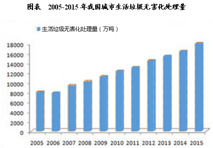 中投顧問發(fā)布的《2017-2021年中國(guó)處理行業(yè)深度調(diào)研及投資前景預(yù)測(cè)報(bào)告》數(shù)據(jù)顯示:2015年,全國(guó)城市生活垃圾清運(yùn)量為19142.17萬噸(約1.91億噸),處理量為18750.64萬噸(約1.88億噸),城市生活率97.95%。截至2015年,共建設(shè)處理廠(場(chǎng))890座,其中填埋場(chǎng)640座,焚...
