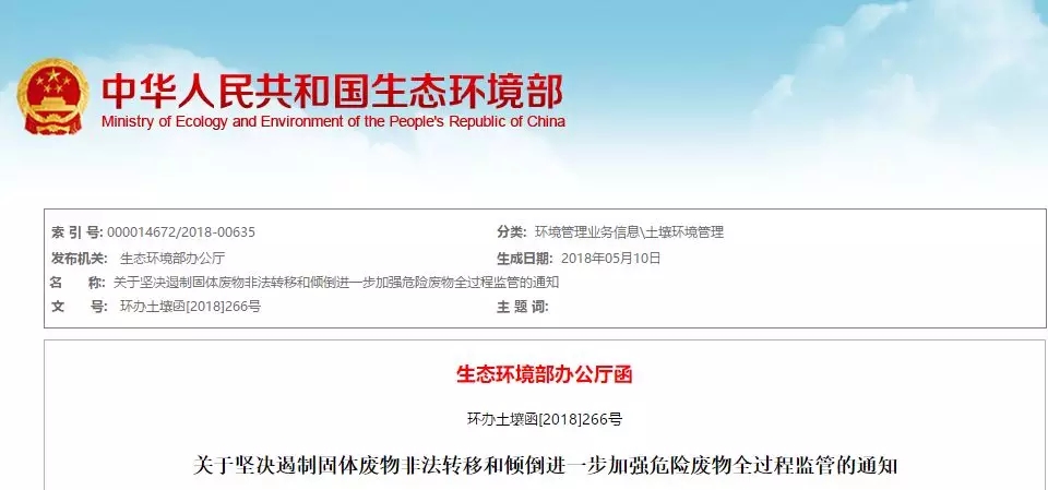 2018年5月10日,生態(tài)環(huán)境部印發(fā)了《關(guān)于堅(jiān)決遏制固體廢物非法轉(zhuǎn)移和傾倒 進(jìn)一步加強(qiáng)危險(xiǎn)廢物全過(guò)程監(jiān)管的通知》(環(huán)辦土壤函〔2018〕266號(hào),以下簡(jiǎn)稱《通知》)。來(lái)源:生態(tài)環(huán)境部《通知》主要要求《通知》要求,各級(jí)生態(tài)環(huán)境部門要以習(xí)近平新時(shí)代中國(guó)特色社會(huì)主義思想為指導(dǎo),全面貫徹落實(shí)黨的十九大精神,...