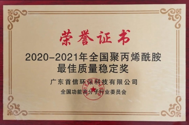 2020-2021年全國(guó)聚丙烯酰胺最佳質(zhì)量穩(wěn)定獎(jiǎng)已出爐,本次獲得該項(xiàng)榮譽(yù)的是——廣東首信環(huán)保材料科技有限公司??上?、可賀、更可嘆!首信環(huán)保獲全國(guó)聚丙烯酰胺最佳質(zhì)量穩(wěn)定獎(jiǎng) 事實(shí)上,廣東首信環(huán)保材料科技有限公司(下稱(chēng)“首信環(huán)保”)已經(jīng)不是第一次獲得該項(xiàng)榮譽(yù)...