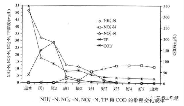 本文通過一張AAO系統(tǒng)內(nèi)污染物的變化曲線針對(duì)每個(gè)段的的水質(zhì)情況進(jìn)行數(shù)據(jù)進(jìn)行分析,了解完這個(gè)就可以快速知道自己系統(tǒng)的問題,其中,各個(gè)單元均是取樣沉淀后,測(cè)定的上清液濃度。 1、AAO系統(tǒng)全流程的COD變化 從曲線中看出:進(jìn)水COD350mg/l左右,厭氧1段:100mg/l左右,厭氧2段:75左右,缺...