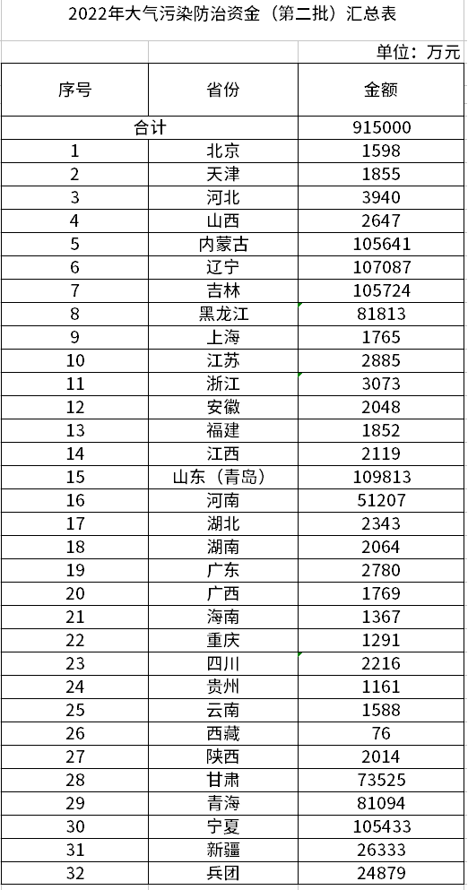 財政部關(guān)于下達2022年度大氣污染防治資金預(yù)算(第二批)的通知 財資環(huán)〔2022〕58號 有關(guān)省、自治區(qū)、直轄市、計劃單列市財政廳(局),新疆生產(chǎn)建設(shè)兵團財政局: 為支持大氣污染防治工作,促進大氣質(zhì)量改善,現(xiàn)下達你省(自治區(qū)、直轄市、新疆生產(chǎn)建設(shè)兵團,以下簡稱省)2022年大氣污染防治資金,用于支持...