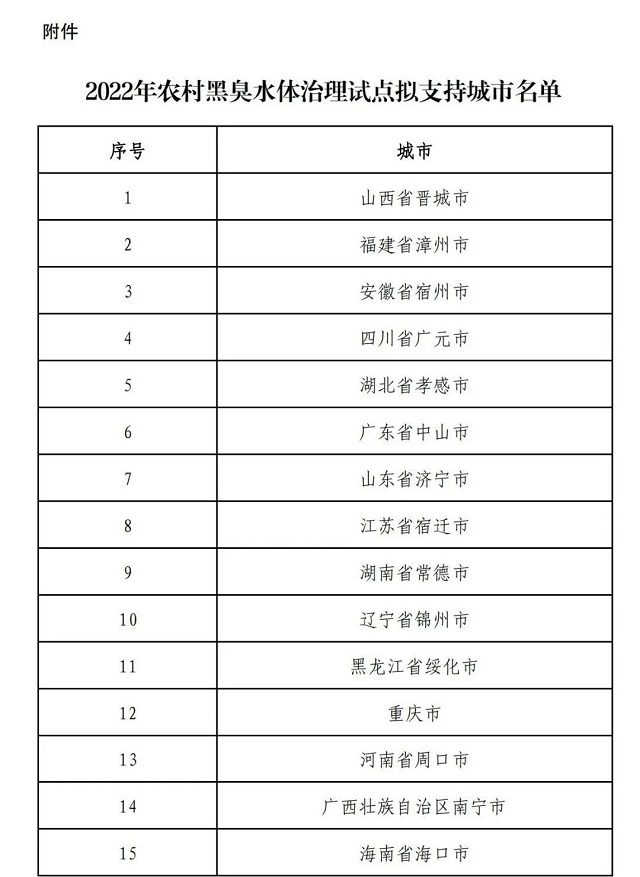 按照《財政部辦公廳 生態(tài)環(huán)境部辦公廳關于開展2022年農村黑臭水體治理試點工作的通知》(財辦資環(huán)〔2022〕5號)要求,財政部會同生態(tài)環(huán)境部組織專家對各地農村黑臭水體治理申報城市實施方案進行了競爭性評審。根據(jù)競爭性評審結果,擬將15個城市確定為2022年支持的農村黑臭水體治理試點城市(詳見附件)。 ...