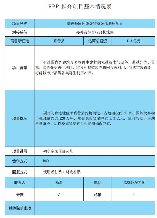 嘉興發(fā)改委發(fā)布2017年嘉興市PPP推介項(xiàng)目匯編。2017年嘉興市推介共95個(gè),總投資766.4億元。涉及、廢棄物處理等5個(gè)。北極星環(huán)保網(wǎng)整理如下:來(lái)源:北極星環(huán)保網(wǎng)