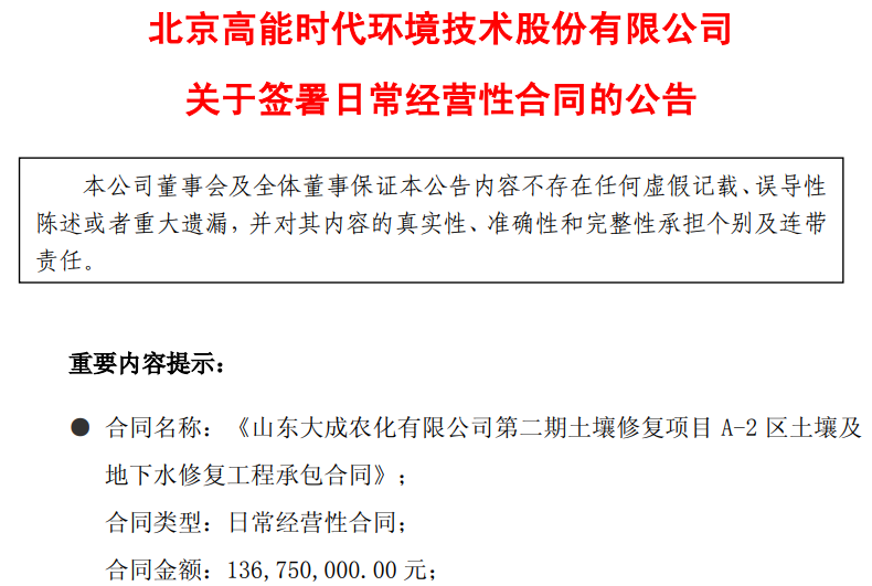中國水網(wǎng)獲悉,5月22日,北京高能時代環(huán)境技術(shù)股份有限公司(以下簡稱“高能環(huán)境”或“公司”)發(fā)布公告稱,公司于近日簽署《山東大成農(nóng)化有限公司第二期土壤修復(fù)項目 A-2 區(qū)土壤及地下水修復(fù)工程承包合同》,合同金額月1.37億。據(jù)悉,工程內(nèi)容包括編制完整的修復(fù)工程施工方案,經(jīng)專家評審后,報淄博市環(huán)保局備...
