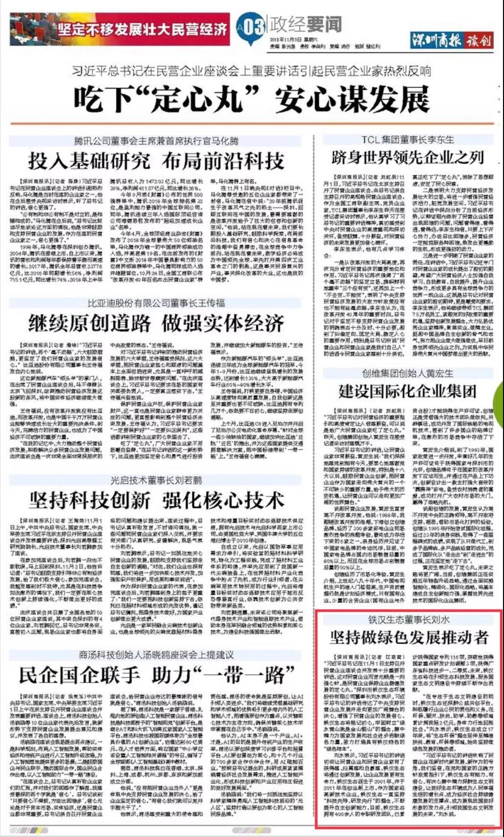 近日,習(xí)近平總書記在民營企業(yè)座談會上的重要講話引起民營企業(yè)家熱烈反響,鐵漢生態(tài)作為生態(tài)環(huán)保龍頭民營企業(yè),劉水董事長積極回應(yīng)。在11月3日《深圳商報》刊登的“堅定不移發(fā)展壯大民營經(jīng)濟(jì)”專題報道中,劉水表示,習(xí)近平總書記的講話切實讓民營企業(yè)和民營企業(yè)家有了獲得感、歸屬感和自豪感。鐵漢生態(tài)將銘記初心,牢固...