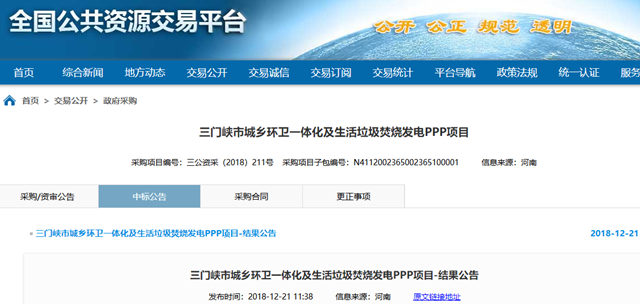 2018年12月21日,河南省三門峽市城鄉(xiāng)環(huán)衛(wèi)一體化及生活垃圾焚燒發(fā)電PPP項(xiàng)目發(fā)布結(jié)果公告,結(jié)果具體如下: 一標(biāo)段預(yù)中標(biāo)社會資本方: 單位名稱:北京環(huán)境有限公司(牽頭人)、北京中科仁和環(huán)??萍加邢薰?聯(lián)合體成員) 報(bào)價(jià)大寫:壹億零伍佰玖拾捌萬捌仟玖佰玖拾伍元叁角貳分每年 小寫:¥10598899...