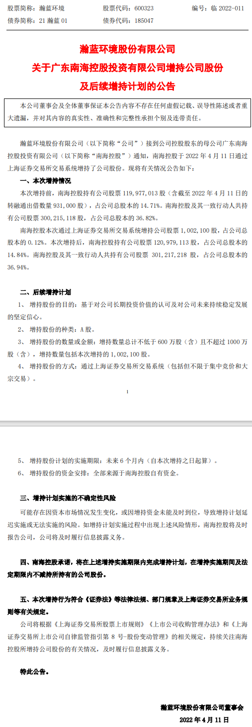 2022年4月11日,瀚藍環(huán)境股份有限公司(下稱“瀚藍環(huán)境”)發(fā)布公告稱,廣東南海控股投資有限公司(下稱“南??毓?rdquo;)已成功通過上海證券交易所交易系統(tǒng)增持了股份。 據(jù)了解,本次增持前,南??毓沙钟绣{環(huán)境14.71%的股份,及其一致行動人共持有瀚藍環(huán)境...