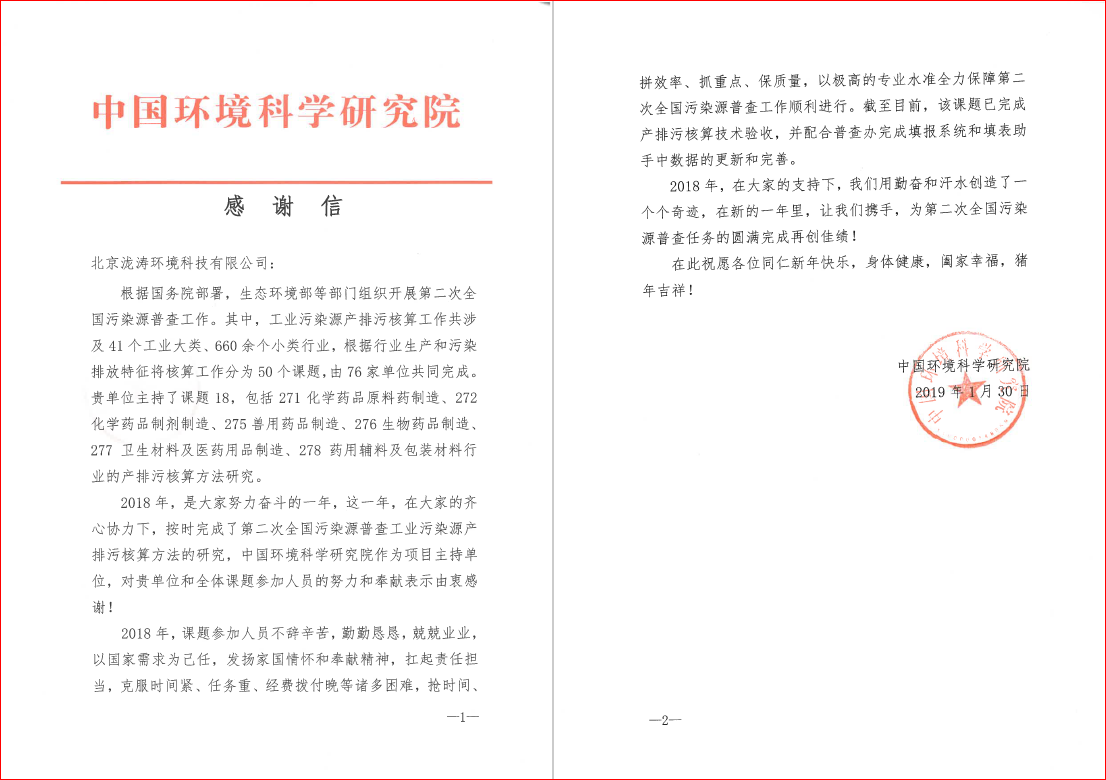近日,北京瀧濤環(huán)境科技有限公司(“瀧濤環(huán)境”)收到了一封來自中國環(huán)境科學研究院(“環(huán)科院”)的感謝信。信中,環(huán)科院對瀧濤環(huán)境在第二次全國污染源普查工業(yè)污染源產(chǎn)排污核算項目中付出的努力表示肯定和由衷感謝。 第二次全國污染源普查工業(yè)污染源產(chǎn)排污核算工作涉及...