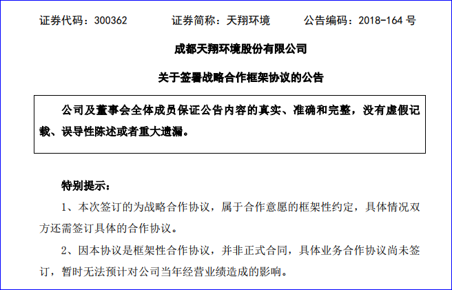 2018年12月24日,天翔環(huán)境公告稱,公司與四川能投水務(wù)投資有限公司在12月21日已經(jīng)正式簽訂了《戰(zhàn)略合作框架協(xié)議》。此次戰(zhàn)略合作協(xié)議的簽訂,意味著陷入債務(wù)泥淖的天翔環(huán)境,再次迎來又一家地方國(guó)資的的“馳援”。 根據(jù)協(xié)議內(nèi)容,雙方擬在本協(xié)議正式簽署后組建專業(yè)團(tuán)隊(duì),對(duì)所涉及合作...