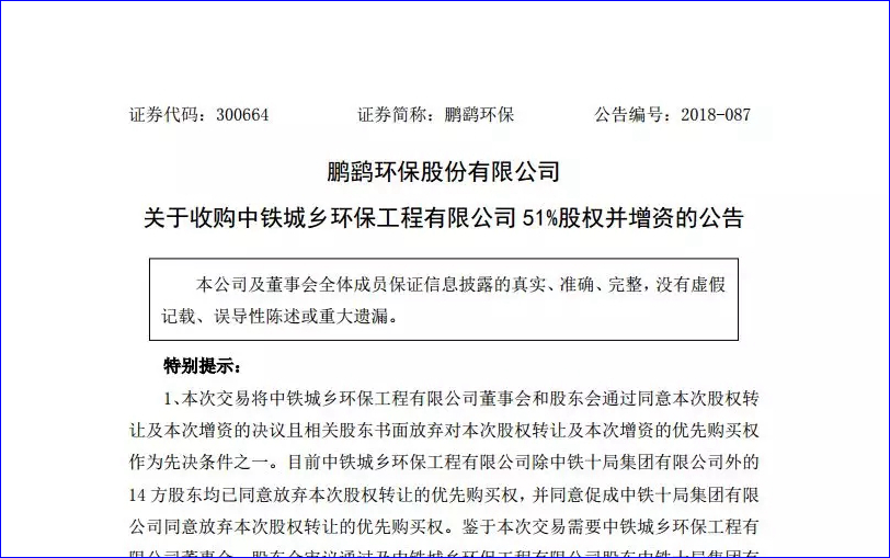 11月19日,鵬鷂環(huán)保股份有限公司開了第二屆董事會(huì)第十八次會(huì)議,審議通過了《關(guān)于收購(gòu)中鐵城鄉(xiāng)環(huán)保工程有限公司51%股權(quán)并增資的議案》,同意公司收購(gòu)中鐵城鄉(xiāng)環(huán)保工程有限公司(以下簡(jiǎn)稱“中鐵環(huán)保”或“標(biāo)的公司”)51%股權(quán)并對(duì)其進(jìn)行增資,其中股權(quán)轉(zhuǎn)讓價(jià)款4...
