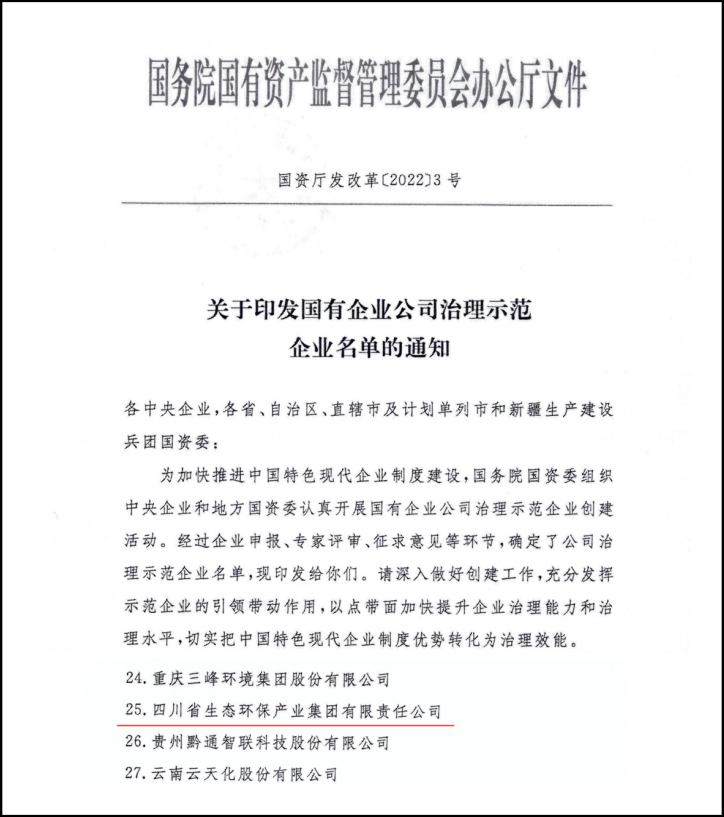 國企改革顯成效 公司治理見真章 四川生態(tài)環(huán)保集團獲評國務(wù)院國資委“國有企業(yè)公司治理示范企業(yè)” 近日,國務(wù)院國資委正式發(fā)布“國有企業(yè)公司治理示范企業(yè)”名單,四川省生態(tài)環(huán)保產(chǎn)業(yè)集團有限責(zé)任公司(以下簡稱“四川生態(tài)環(huán)保集團”)成功入選...
