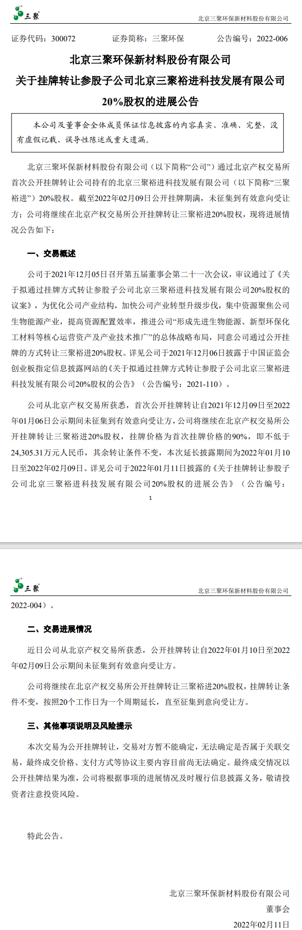 2022年2月11日,北京三聚環(huán)保新材料股份有限公司發(fā)布《關于掛牌轉讓參股子公司北京三聚裕進科技發(fā)展有限公司20%股權的進展公告》。 公告顯示,自2021年12月09日,截至2022年02月09日公開掛牌期滿,參股子公司北京三聚裕進科技發(fā)展有限公司20%股權在北京產(chǎn)權交易所公開掛牌未征集到有效意向受...