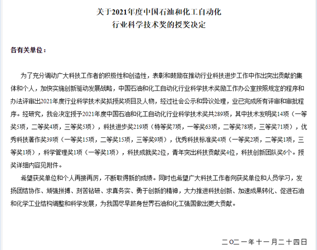 近日,由中國石油西南油氣田分公司天然氣研究院主持,四方光電參與的“天然氣中硫化物光譜檢測技術研究及應用”項目榮獲2021年度中國石油與化工自動化行業(yè)科技進步一等獎。中國石油與化工自動化行業(yè)科學技術獎是經國家科學技術部批準(國科學社證字第0109號)設立的,主要評選在石油與化工...