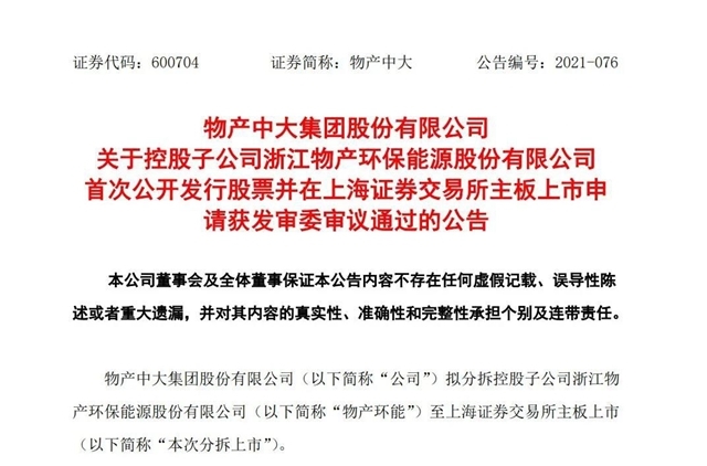 2021年9月30日,物產(chǎn)中大發(fā)布關(guān)于控股子公司浙江物產(chǎn)環(huán)保能源有限公司首次公開發(fā)行股票,并在上海證券交易所主板上市申請(qǐng)獲發(fā)審委審議通過的公告。 公告顯示,物產(chǎn)中大集團(tuán)股份有限公司(以下簡(jiǎn)稱“公司”)擬分拆控股子公司浙江物產(chǎn)環(huán)保能源股份有限公司(以下簡(jiǎn)稱“物產(chǎn)環(huán)能...